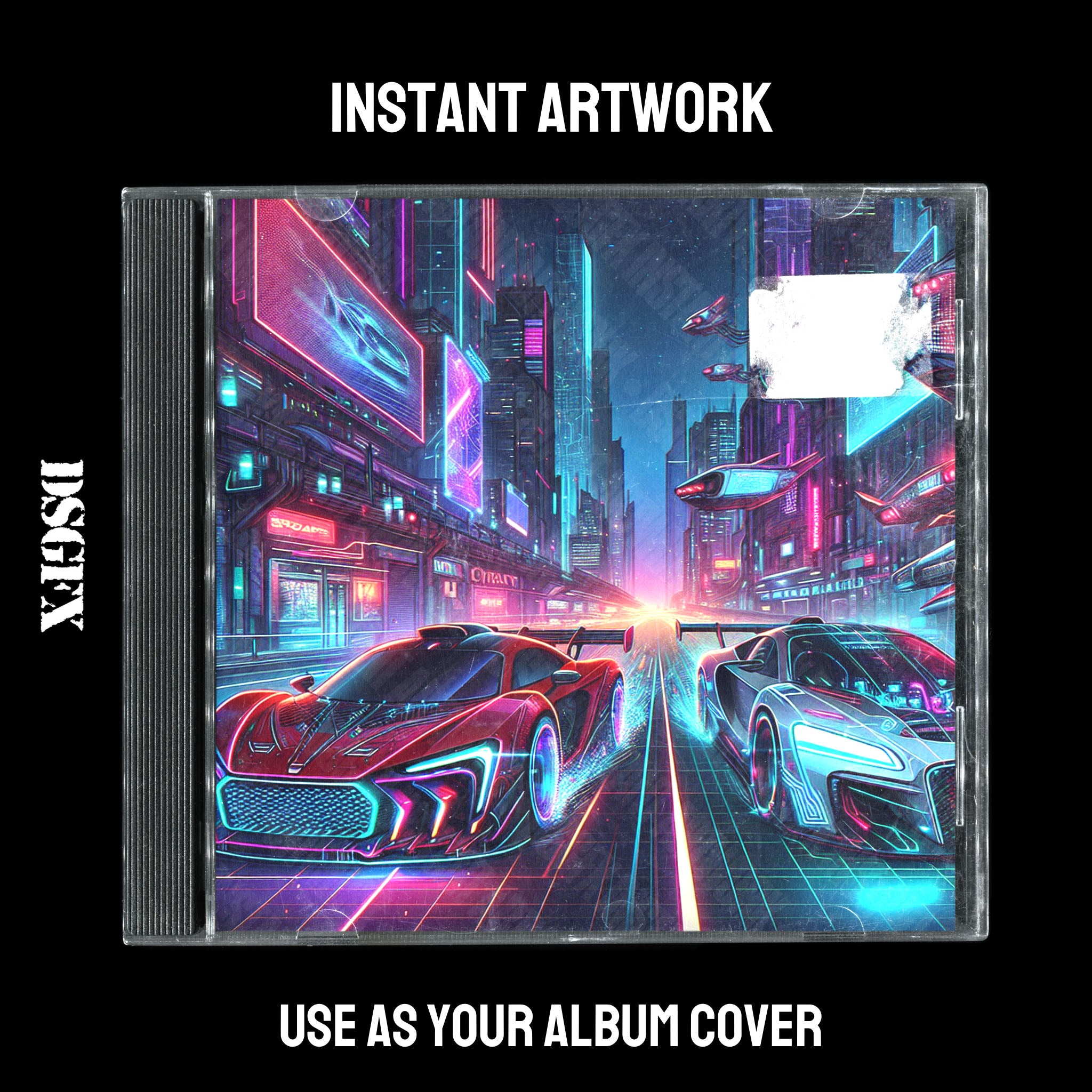 This vibrant cover art features two futuristic sports cars racing through a neon-lit cyberpunk cityscape, exuding a sense of high energy and cutting-edge style. The illuminated skyscrapers and flying vehicles in the background create an immersive scene that is ideal for electronic, synthwave, or gaming-themed music tracks, particularly suited for artists seeking to convey a sense of speed, technology, and modernity.