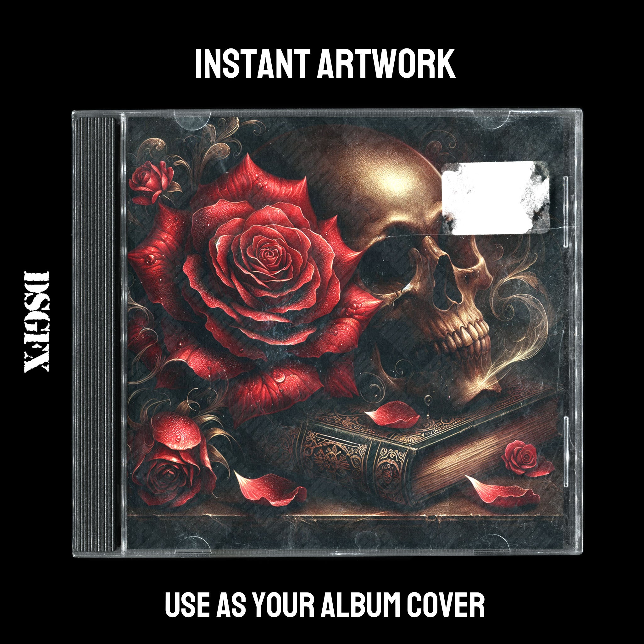 This hauntingly beautiful cover art features a striking image of a golden human skull juxtaposed with vibrant red roses, symbolizing a blend of life and death. The artwork is laid on top of an antique book with intricate details, and soft wisps of smoke meander around the composition, adding to the mystical vibe. Ideal for hard rock, metal bands, or artists with a gothic aesthetic seeking to convey themes of mortality, beauty, romance, or sorrow in their music.