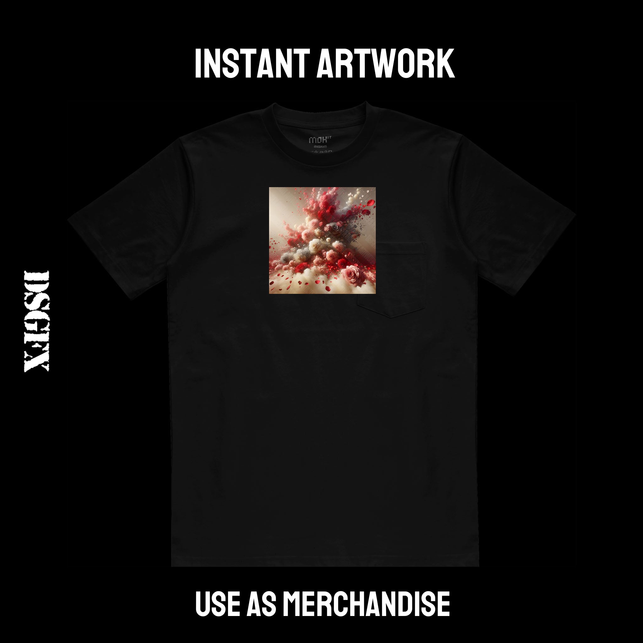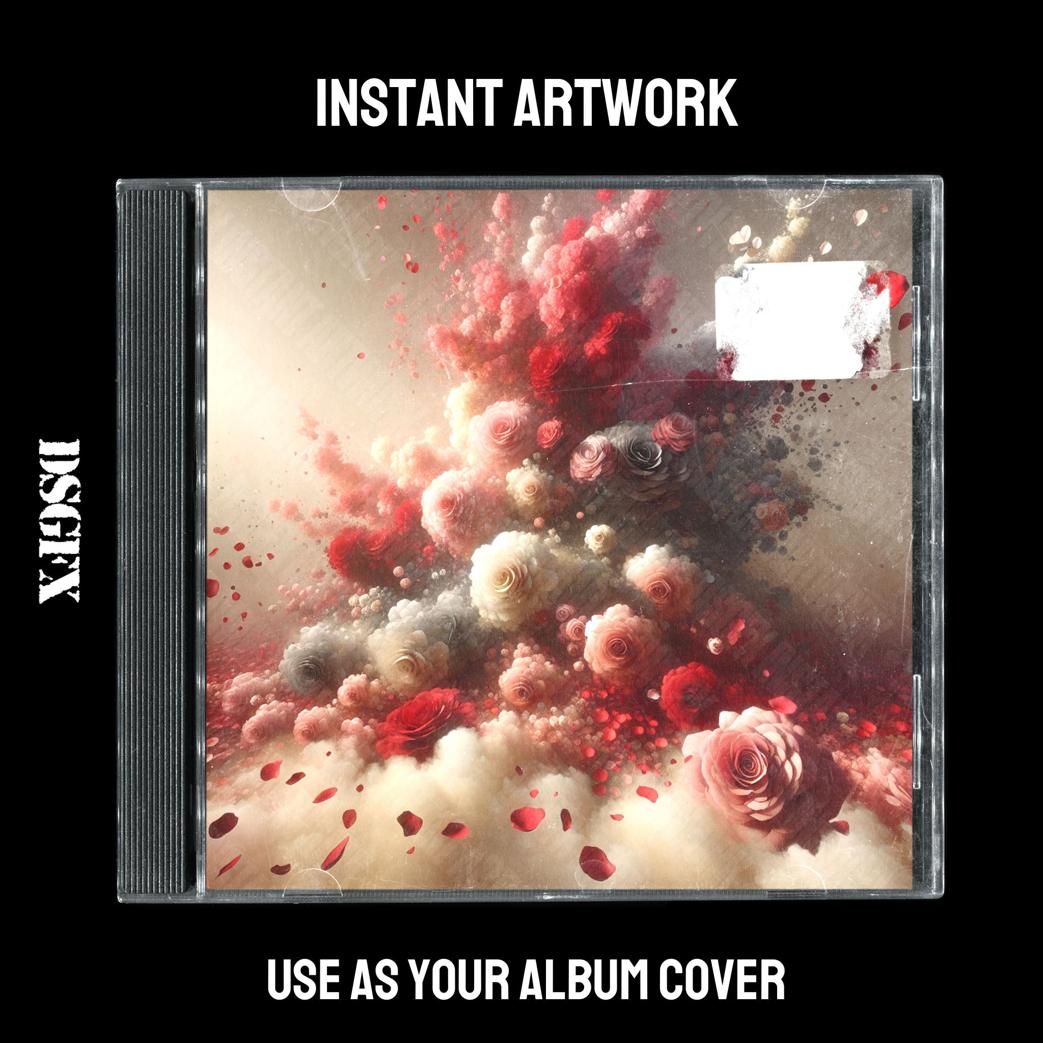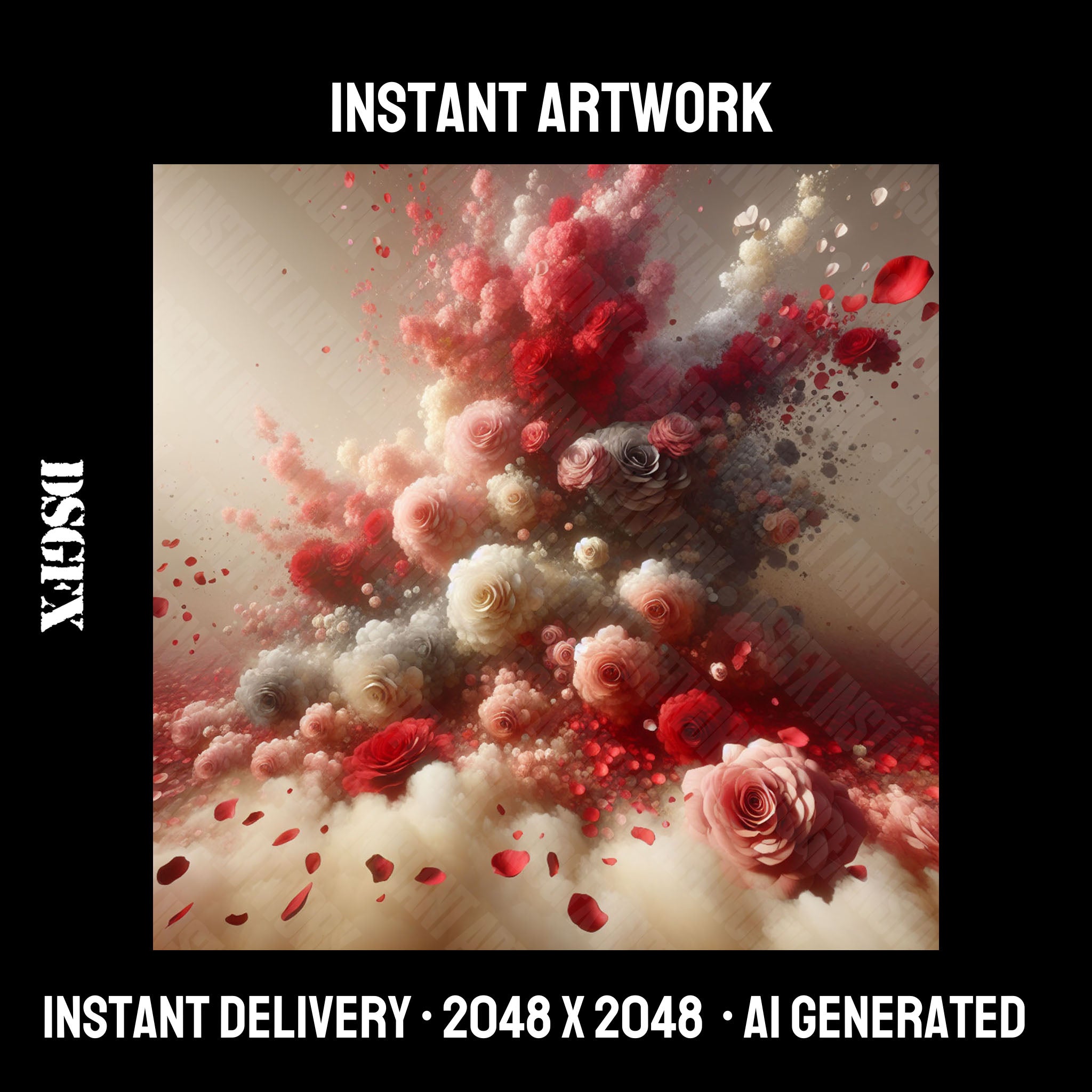 A mesmerizing explosion of flowers, this artwork features a dynamic array of roses in various shades of red, pink, and white bursting into a spectrum of colors against a dark chiaroscuro backdrop. With petals seemingly suspended in time, it evokes feelings of passion and intensity. Ideal for artists seeking a visual representation of growth, transformation, or powerful emotions in their music, this piece can vividly complement genres like soulful R&B, emotive rap, or evocative rock.