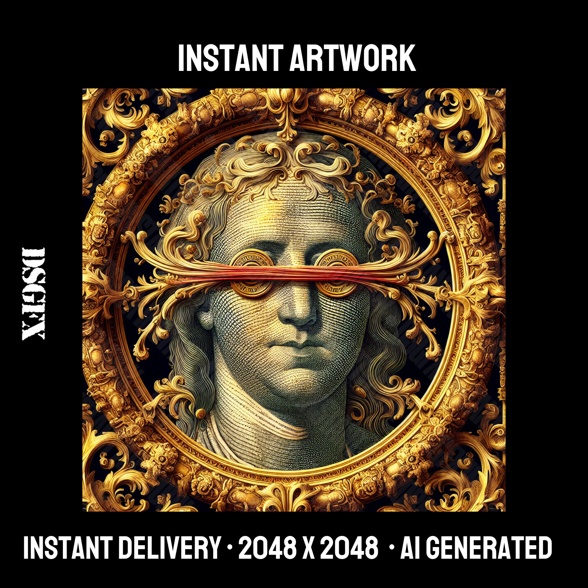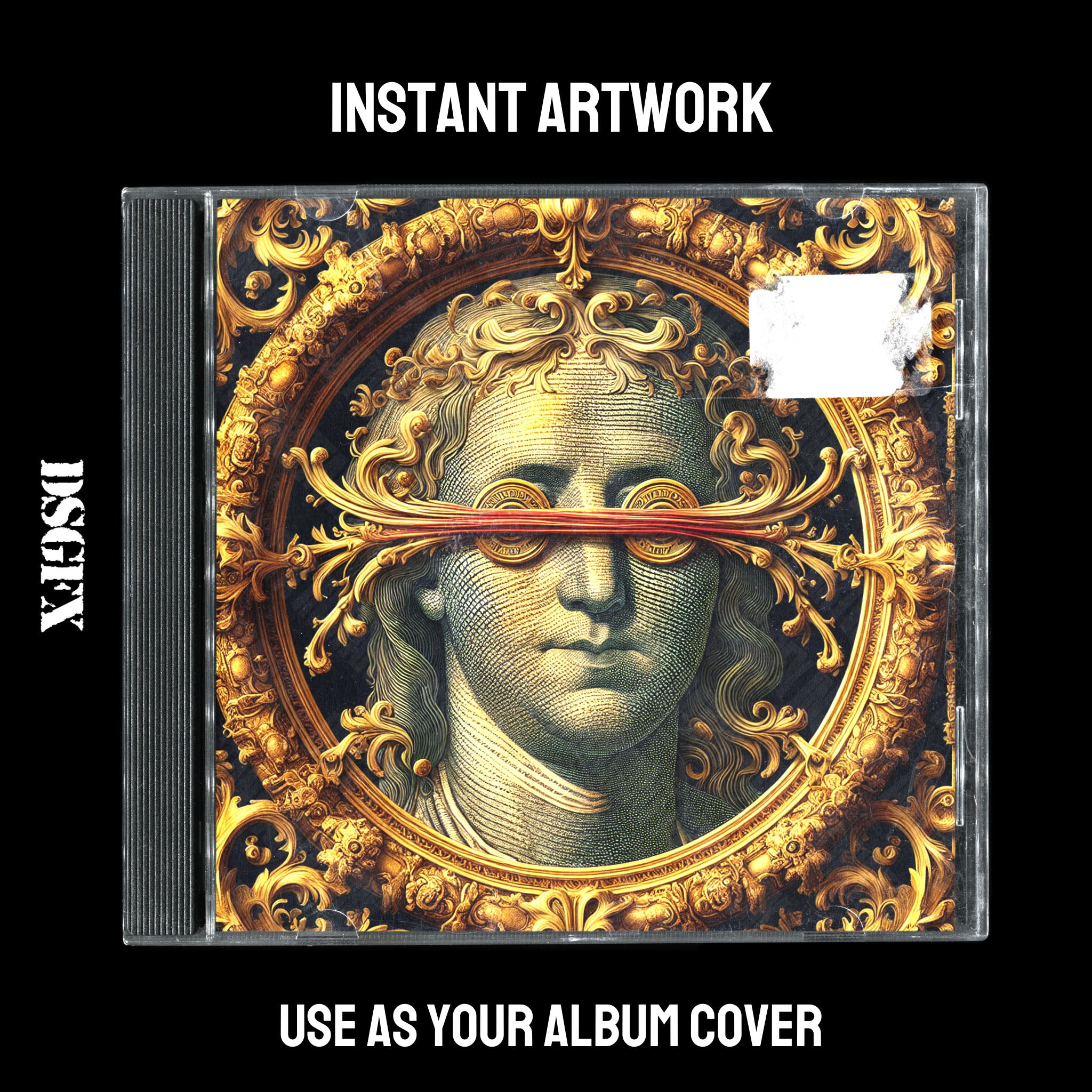 This artwork features a classical sculpture framed by ornate golden baroque elements, conveying a sense of timeless grandeur and sophistication. The central figure exudes an air of mystery with its eyes covered by a red strip, adding a modern twist to the historical art. This cover art is ideal for musical genres that blend traditional sounds with contemporary beats, such as symphonic metal, baroque pop, or artists looking for a fusion of old-world aesthetics with modern flair.