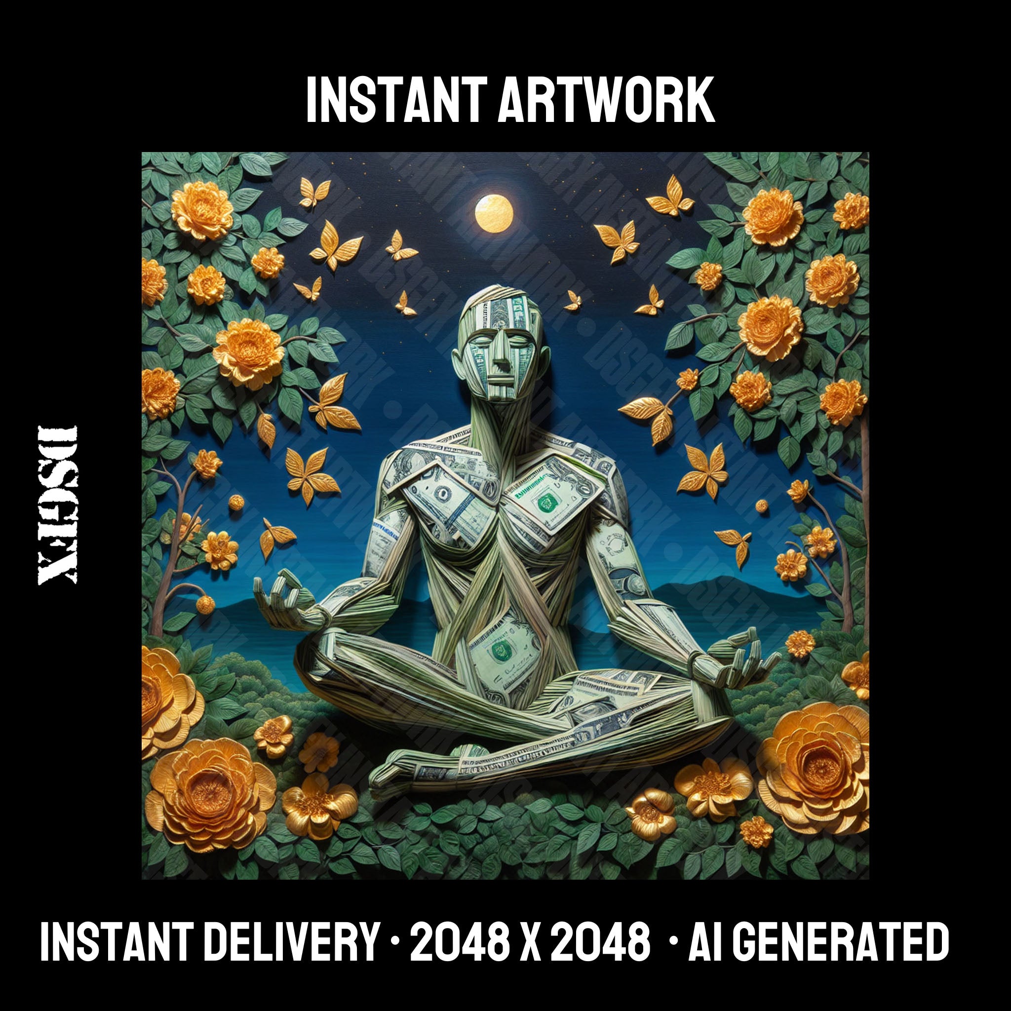 Artwork can be used for music, merchandise, website, and any commercial use case. This art is generated by Dalle-3. Edited & upscaled by DSGFX.