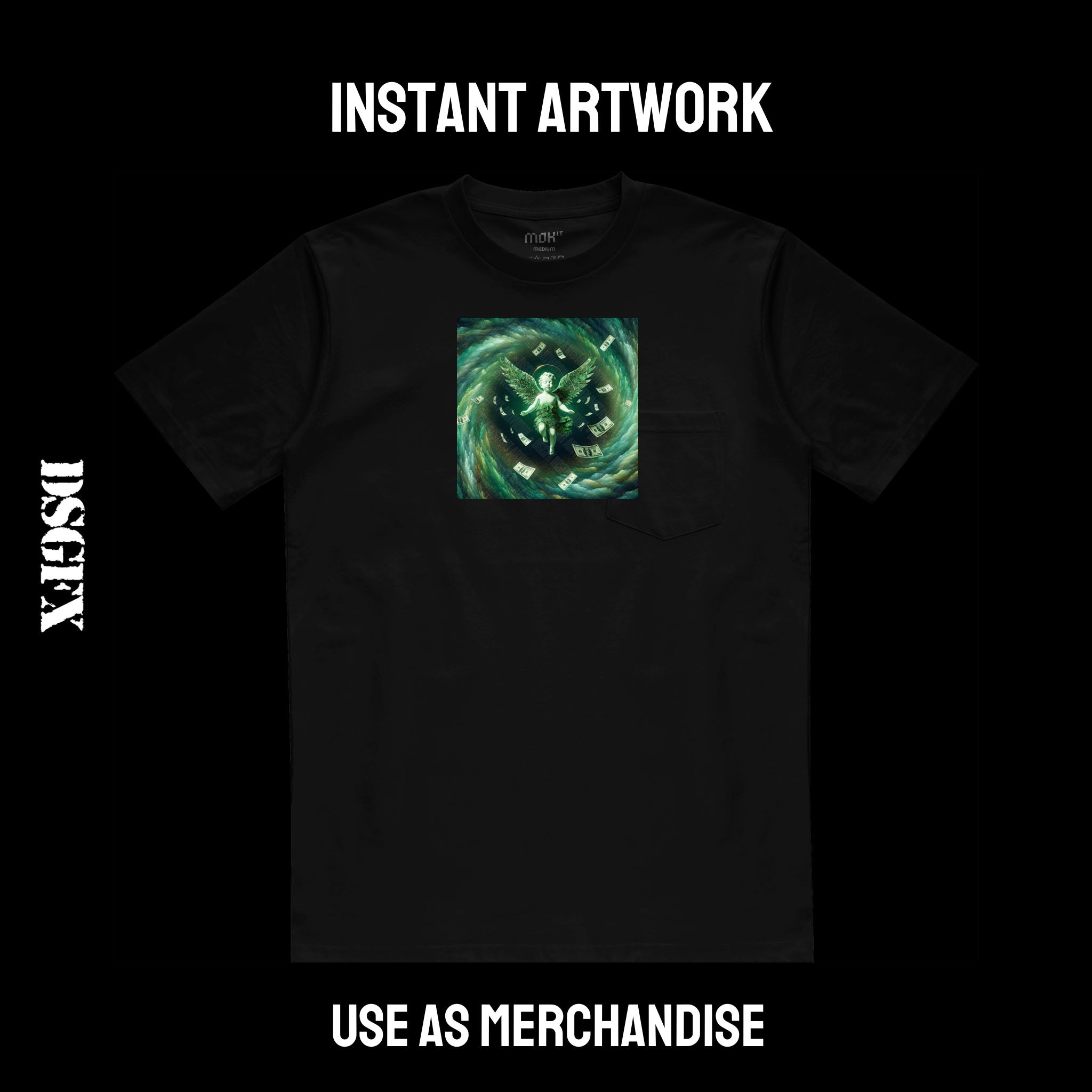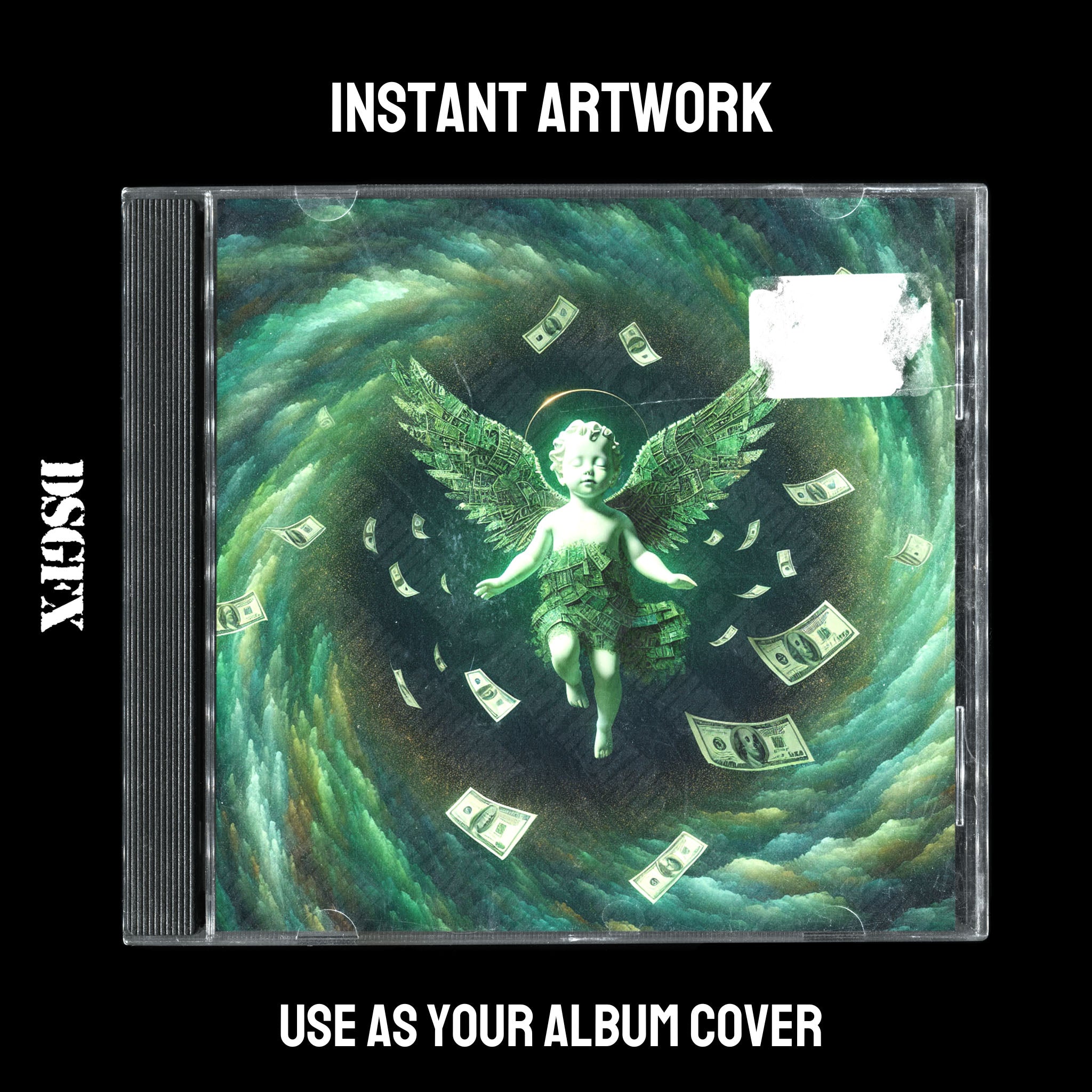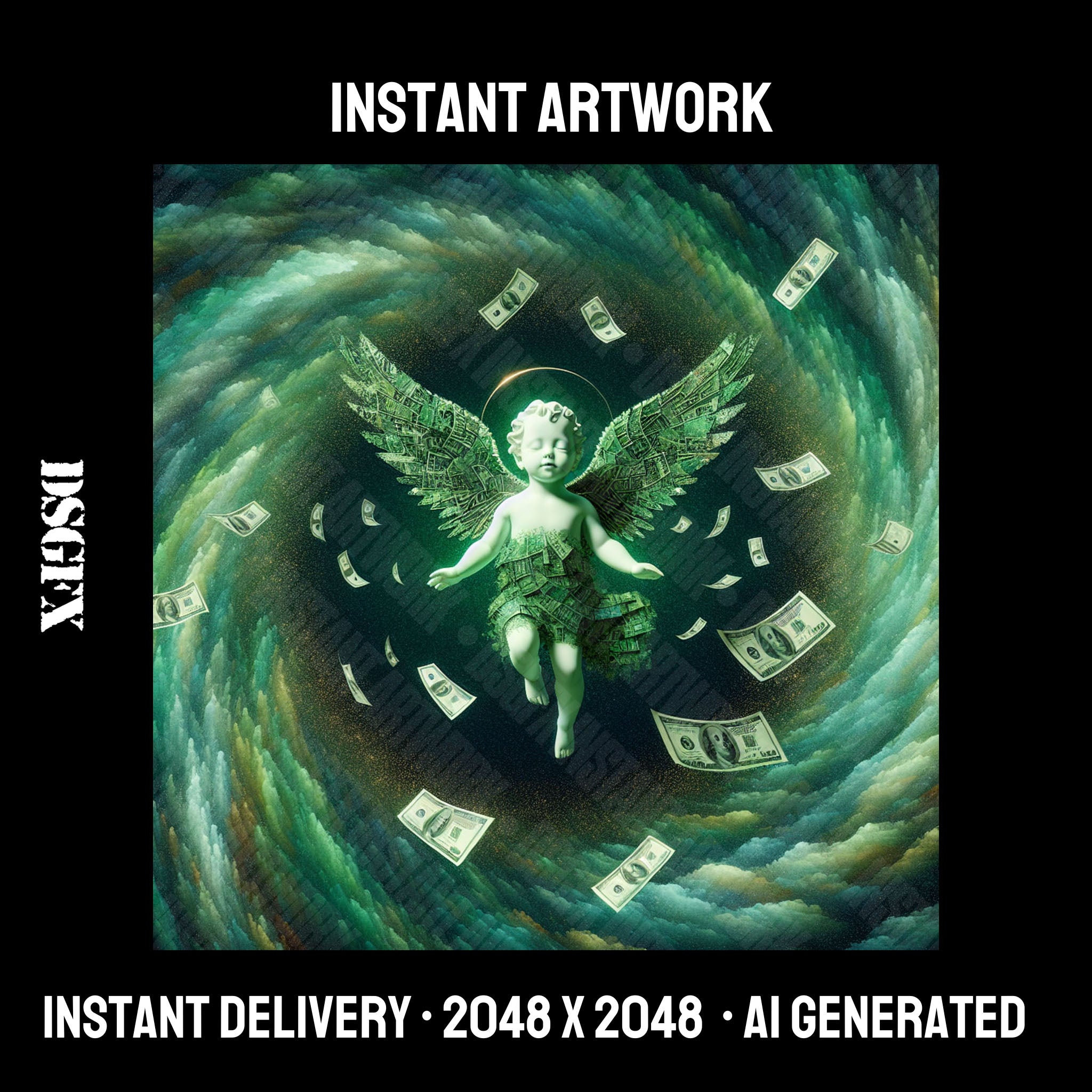 This artistic representation showcases a cherub adorned with wings made of various denominations of currency, metaphorically flying through a vortex of swirling green hues that give an impression of opulence and power. The timeless appeal of the cherub juxtaposed against a modern symbol of wealth provides an intriguing visual narrative, ideal for artists conveying themes of prosperity, the intersection of innocence and commerce, or the dichotomy between the ephemeral and the materialistic. Vibrant and rich in symbolism, this piece would suit a variety of music genres looking to make a bold statement, from hip-hop to soul, and even to ambitious indie artists.