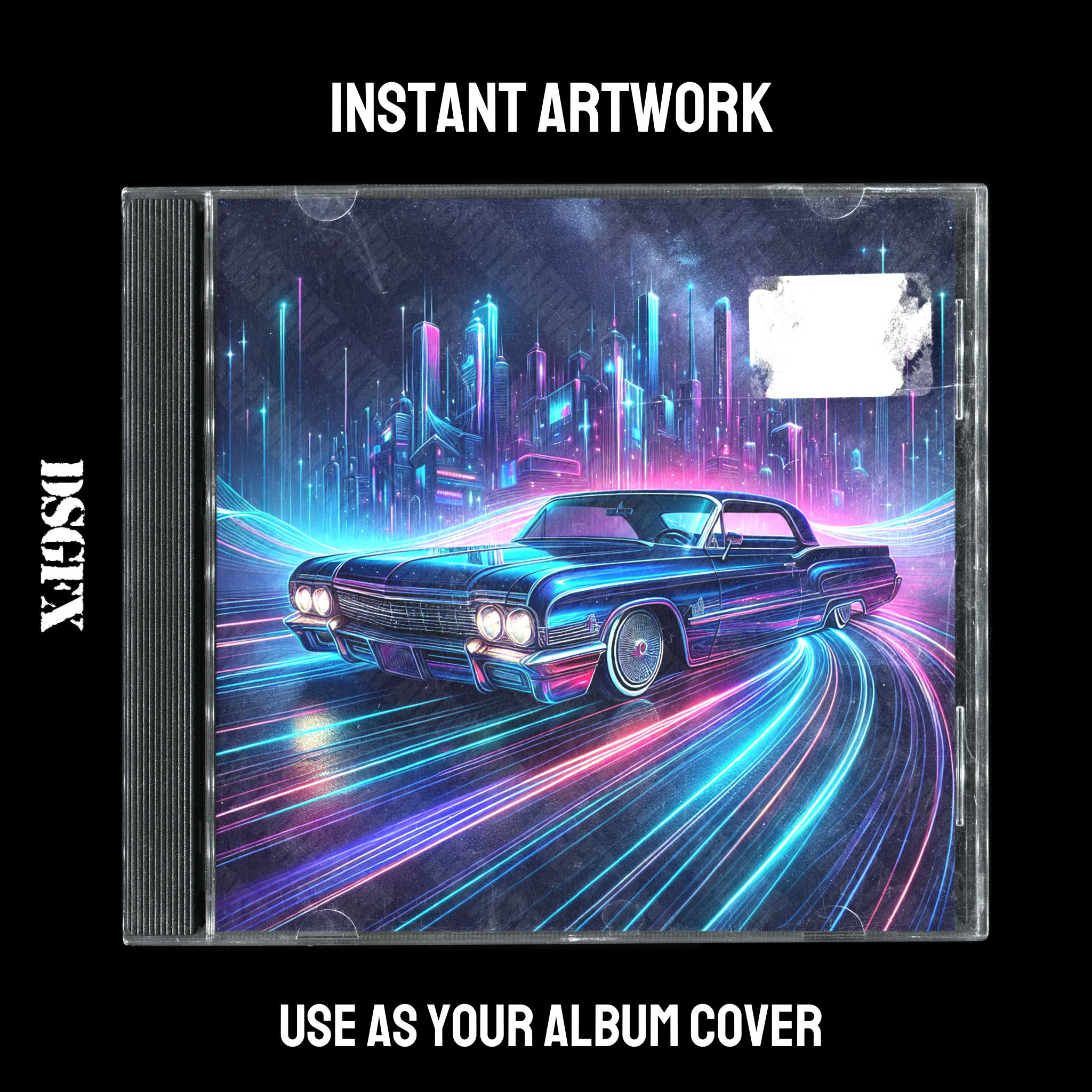 This album cover art features a classic car with a chrome finish set against a vibrant neon-lit backdrop that suggests a futuristic cityscape with dynamic speed lines giving a sense of motion. It combines nostalgic vibes with a modern, cyberpunk aesthetic, making it an ideal fit for synthwave, vaporwave, retro-futuristic genres, as well as rappers looking for a blend of old-school cool with contemporary edge. This artwork could also complement electronic or rock artists aiming for a visual that encapsulates the fusion of past and future influences.