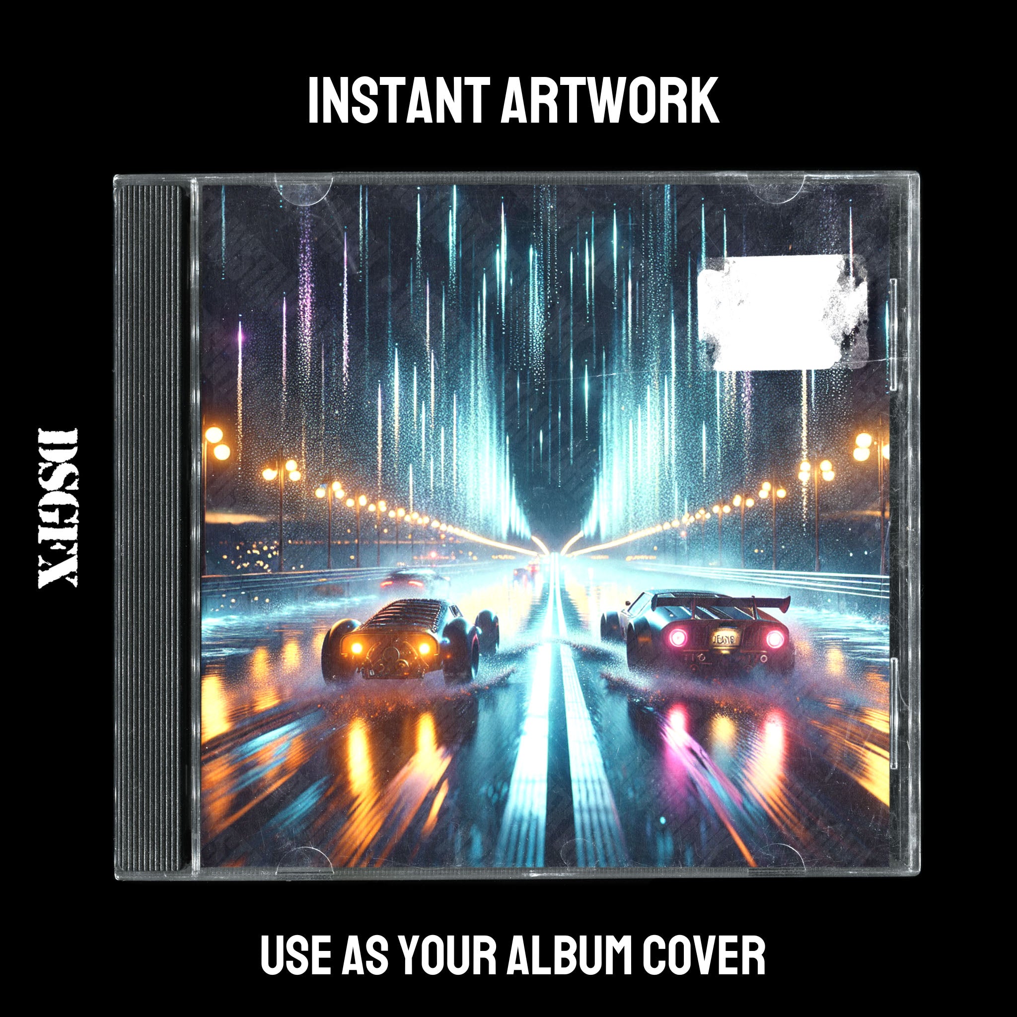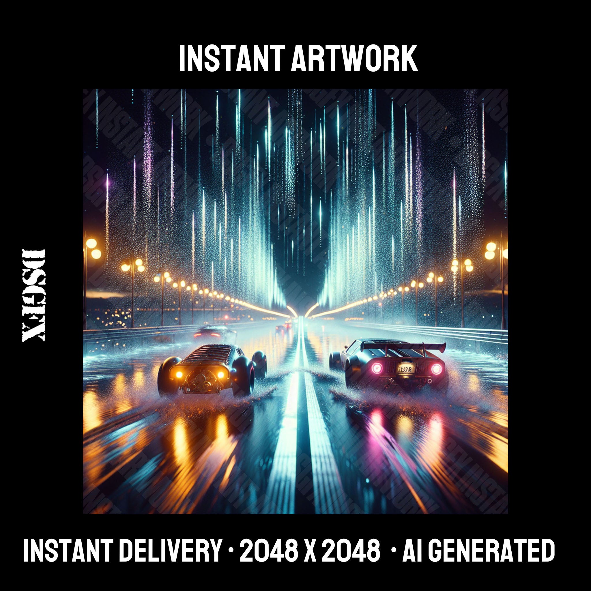 This graphic depicts a dynamic nighttime race scene with a pair of sleek sports cars speeding down a rain-soaked city street, illuminated by a dazzling array of vertical neon light streaks creating a sense of urgency and high energy. With its vivid colors and sense of movement, this piece would be an ideal visual match for energetic and fast-paced music genres, such as hip-hop, electronic, or high-octane rock. It can set the tone for artists looking to convey a theme of speed, competition, or the futuristic urban nightlife in their music branding.