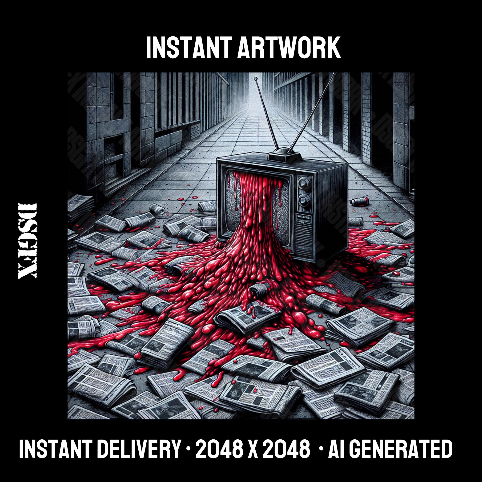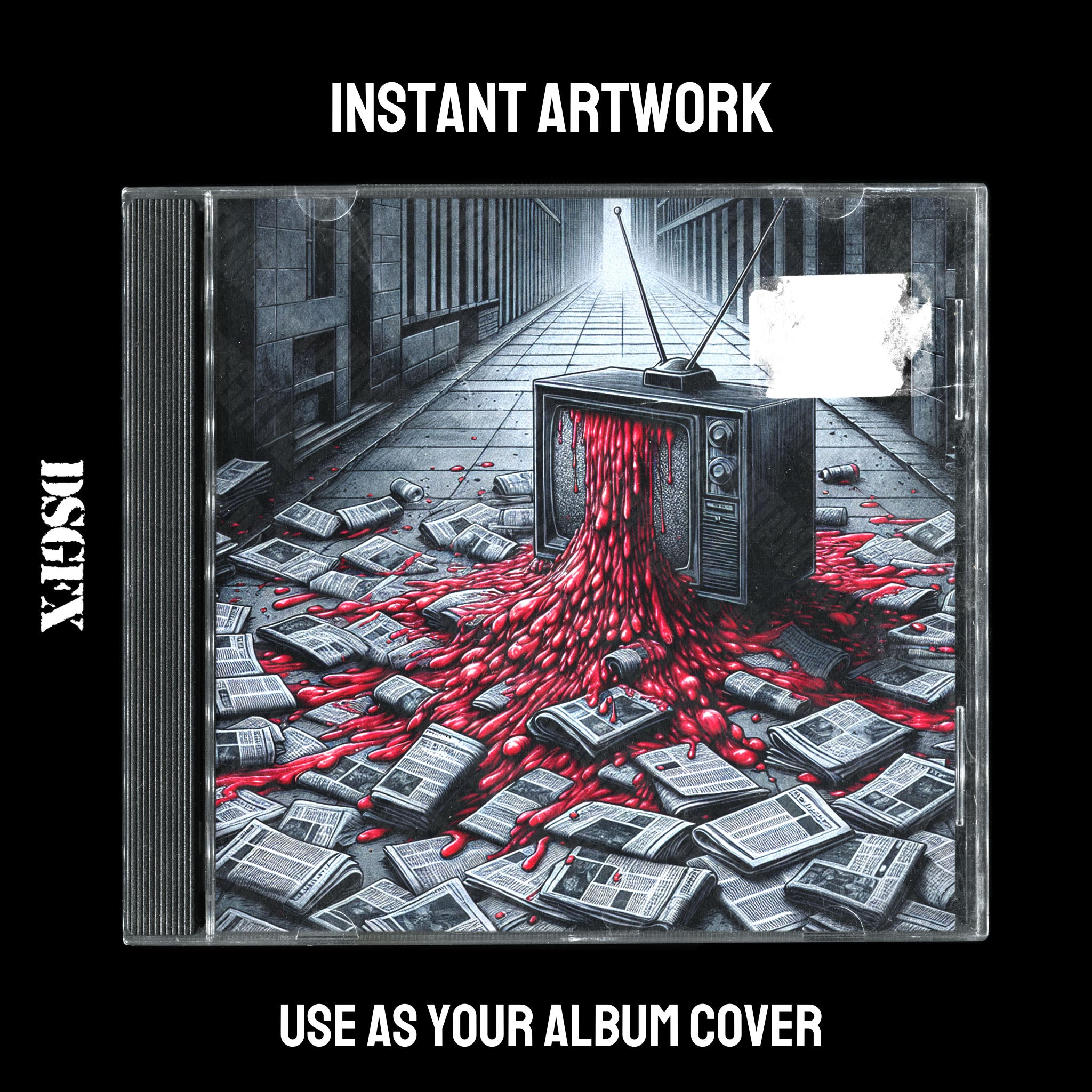 This evocative album cover art depicts a vintage television set in an empty urban alley, overflowing with a vivid red substance that floods the surrounding area, which is littered with discarded newspapers. The surreal scene invokes a sense of alternative reality, rebellion, and thought-provoking concepts, ideal for indie rock bands, experimental musicians, or hip-hop artists looking for a cover that speaks to societal themes and the unexpected.