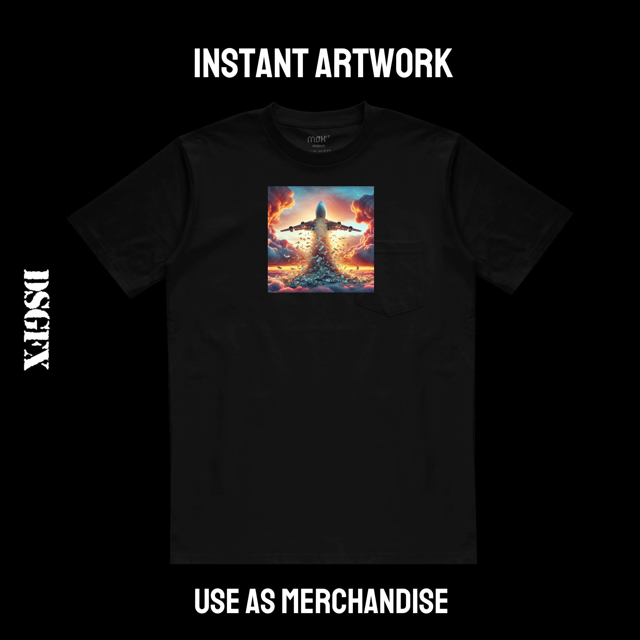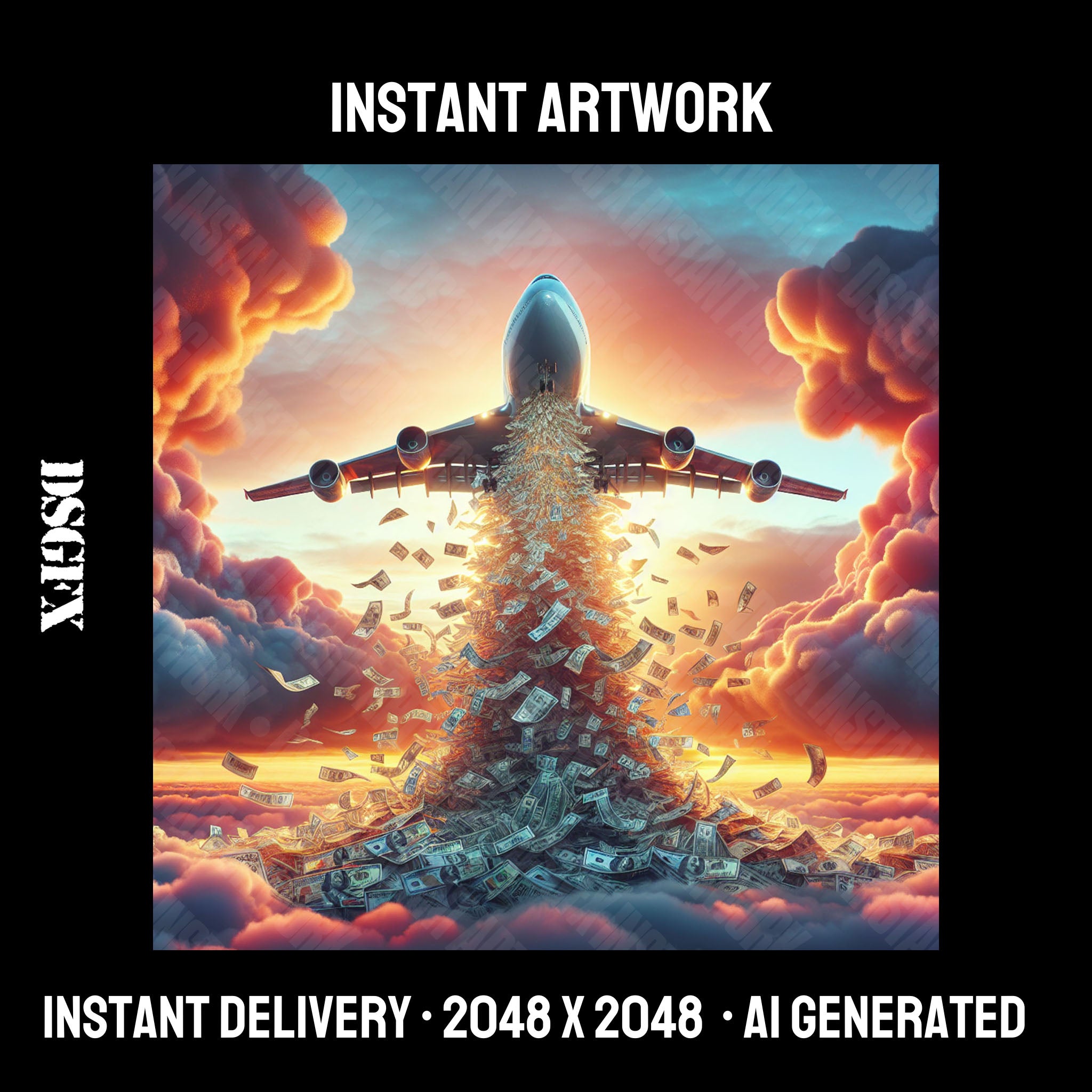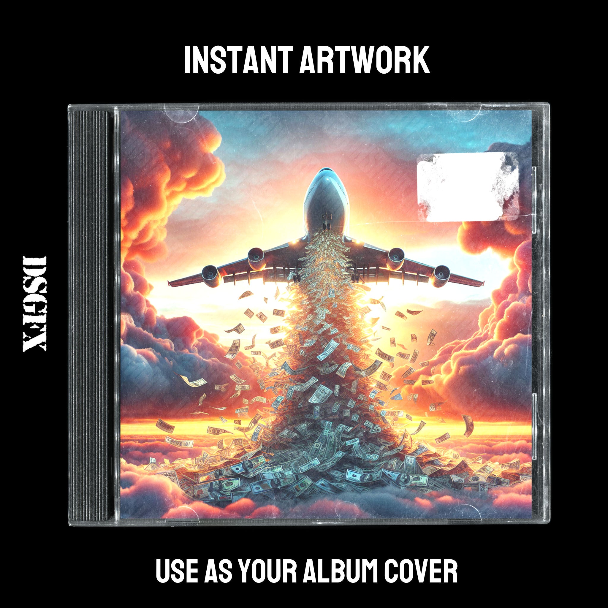 Captivate your audience with the powerful symbolism of ascension and wealth in this dynamic and impactful imagery, featuring a commercial jet soaring into a sunset sky, with a massive vortex of currency swirling upwards from the ground. The vibrant and contrasting color palette of fiery orange and cool blues evoke a sense of ambition and grandeur, ideal for artists channeling themes of success, dreams, and high-flying aspirations in their music.