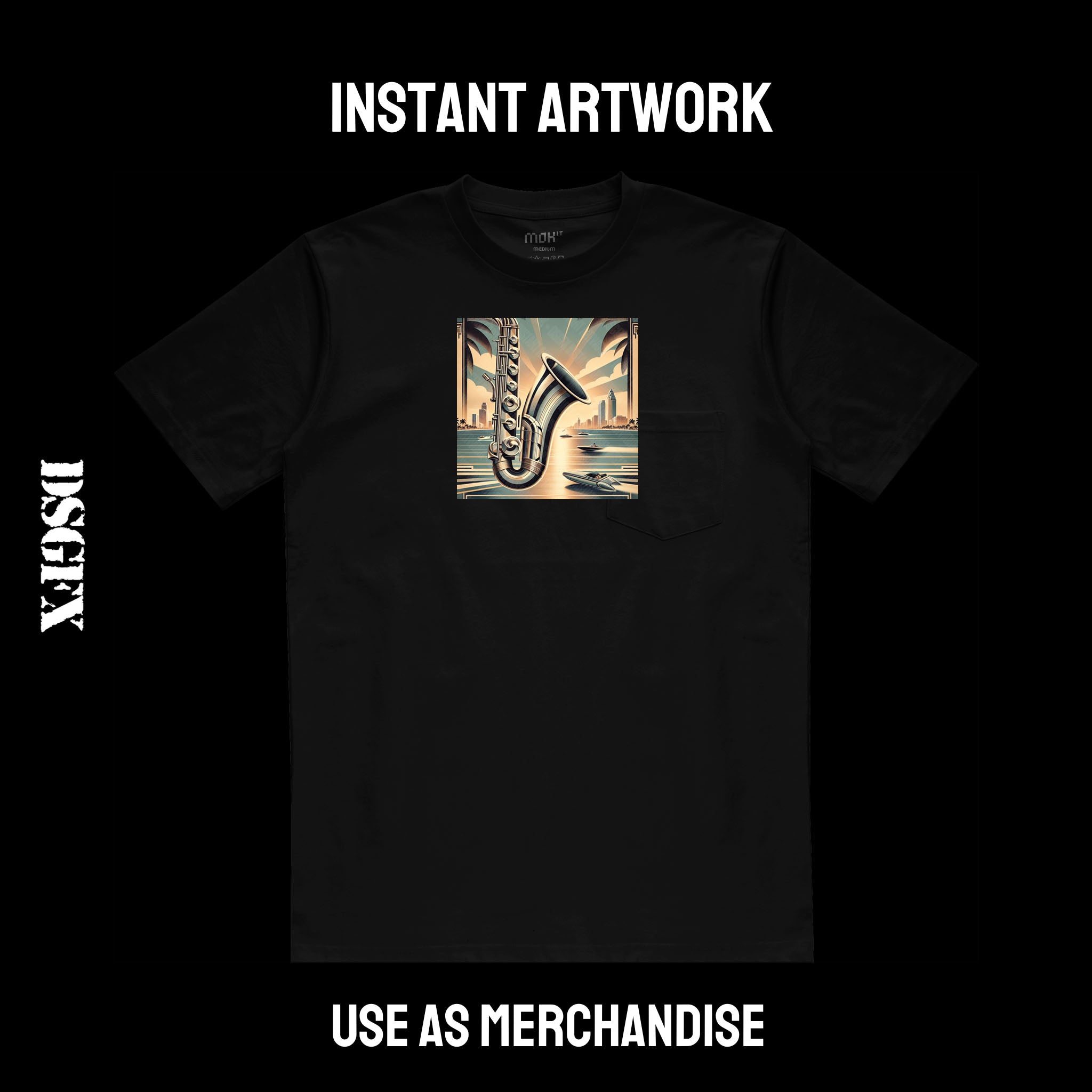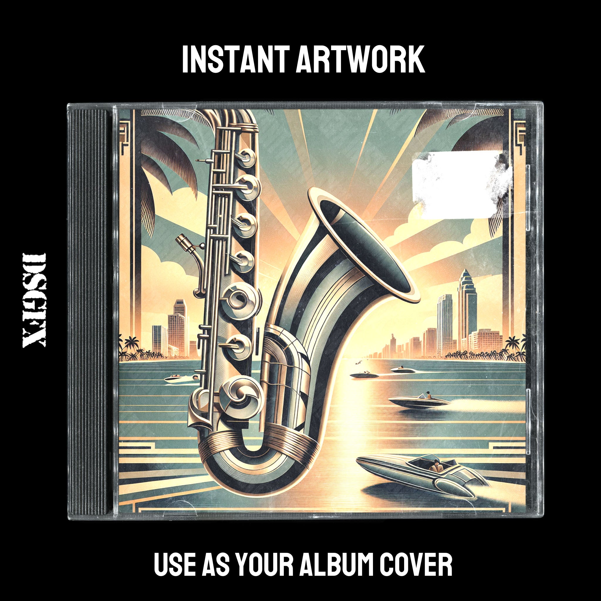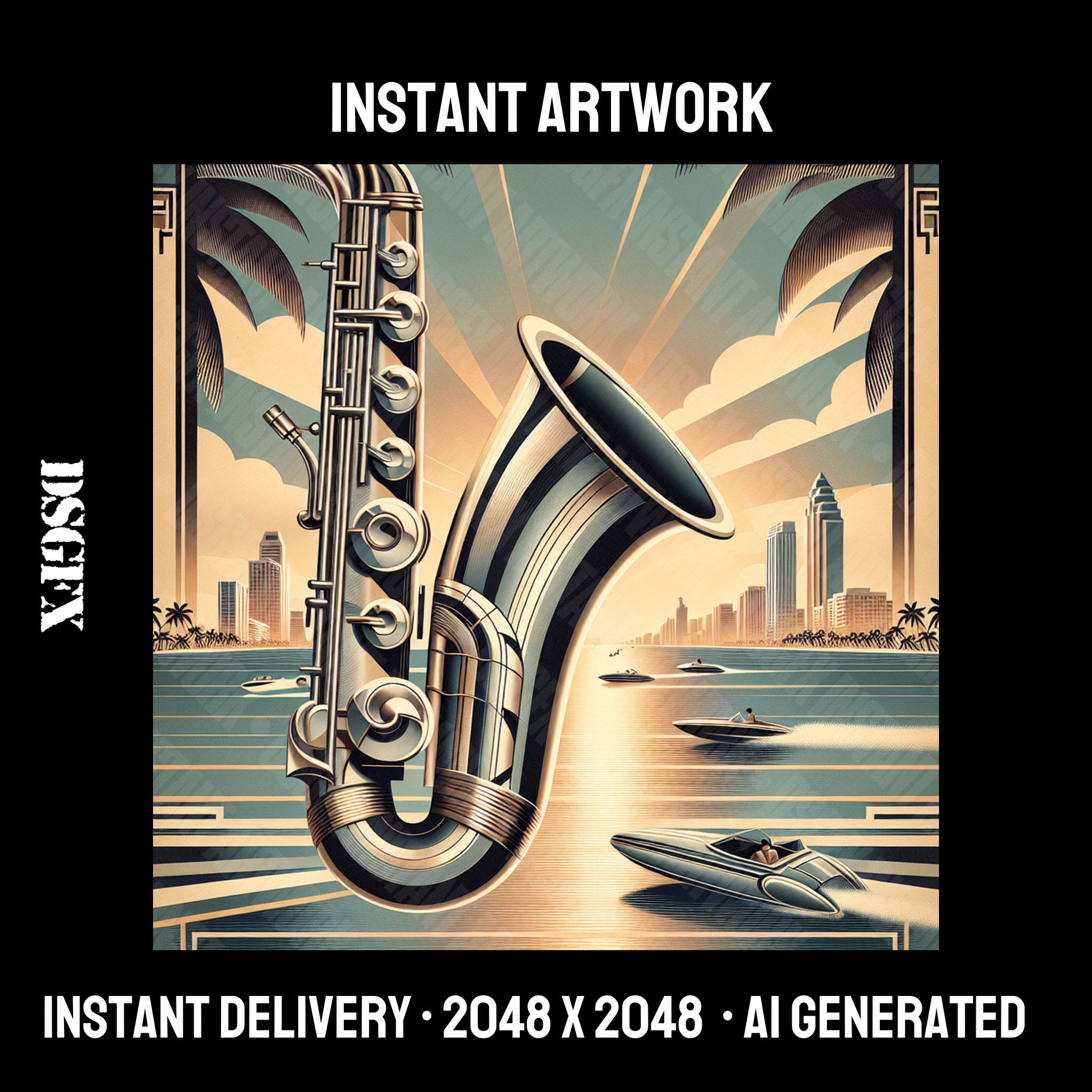 This graphic artwork presents a stylized saxophone with its curves and keys merging into an art deco-inspired seascape. The gleaming instrument stands against a backdrop of radiant sun rays, palm fronds, and far-off city architecture, infusing a sense of vintage nostalgia reminiscent of classic jazz era aesthetics. This visual harmony is an ideal choice for jazz enthusiasts, soulful singers, and musicians looking to convey a blend of retro allure and timeless sophistication in their branding.