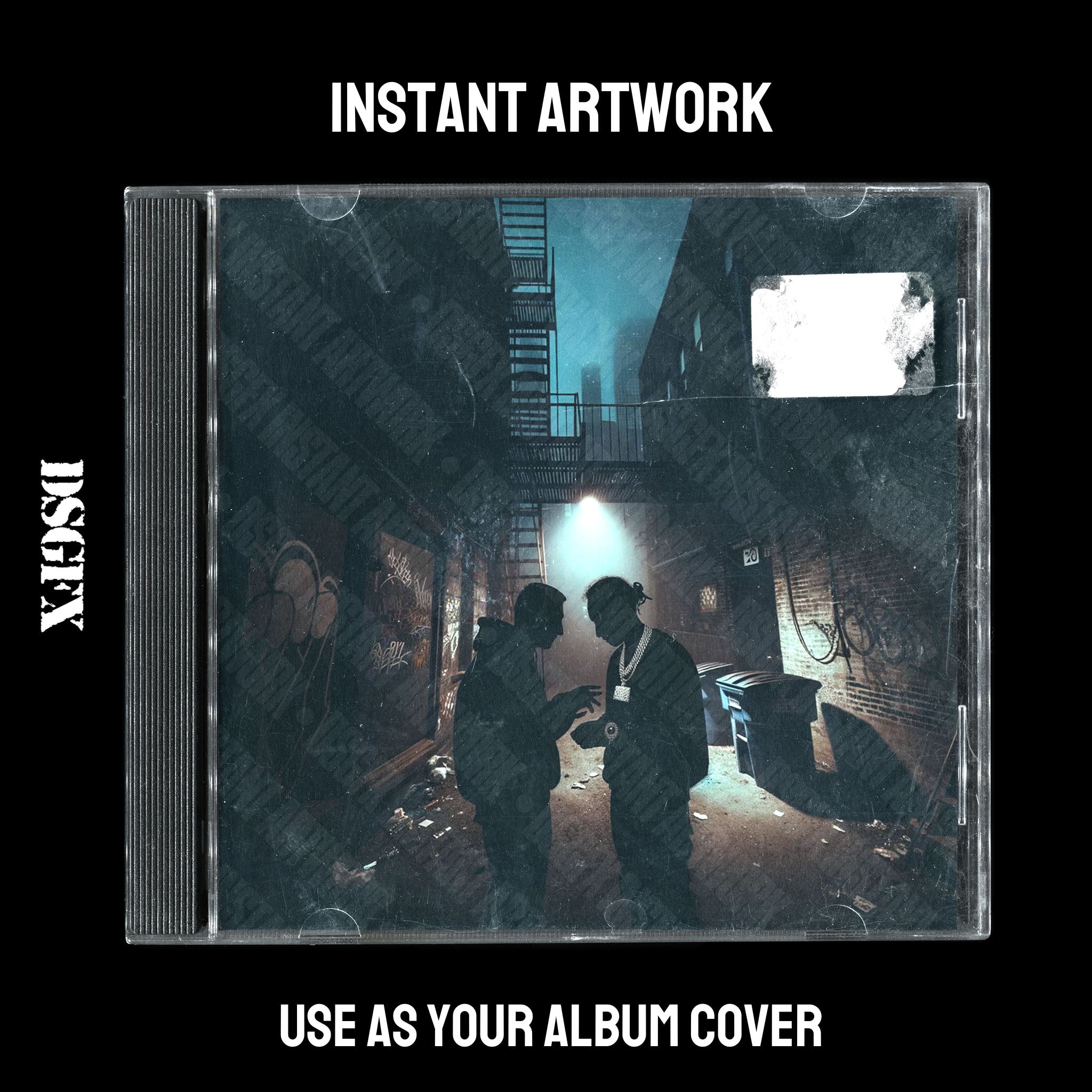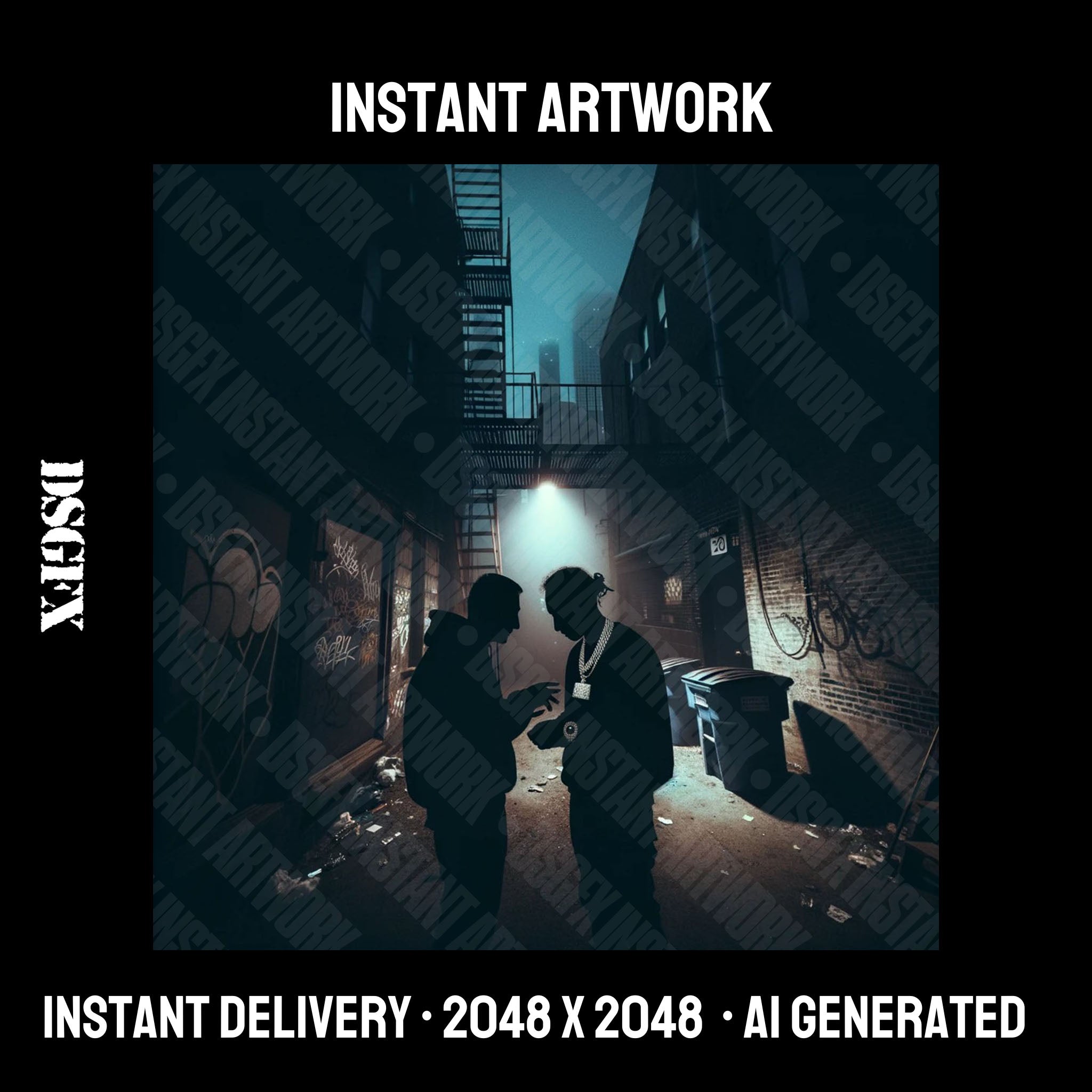 This atmospheric album cover captures a dimly lit urban alleyway scene, highlighting two shadowy figures in a secretive exchange, with graffiti on the walls adding to the gritty, streetwise aesthetic. This moody and evocative imagery is ideal for hip-hop artists or rappers looking to convey themes of urban life, mystery, and the underground scene.