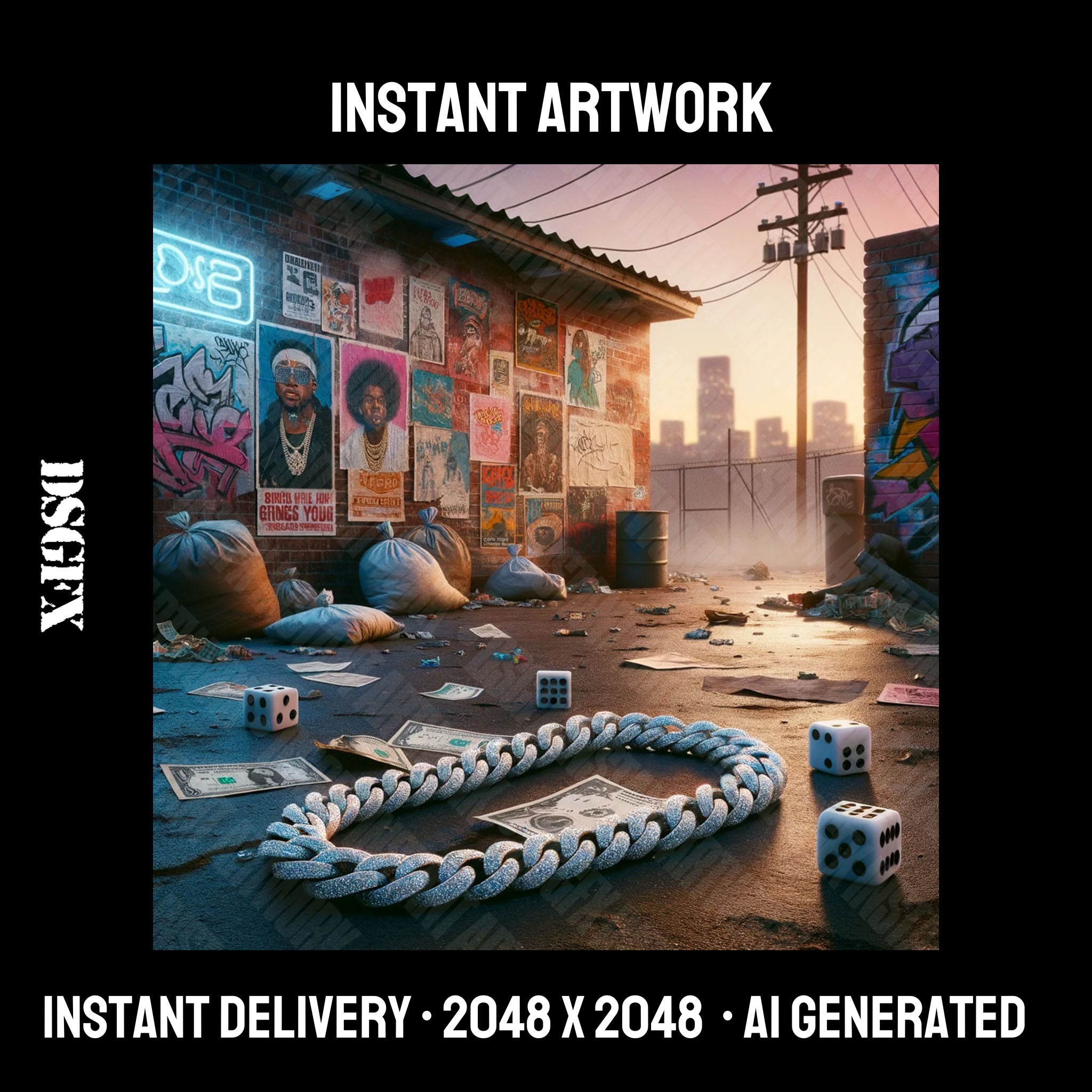This evocative urban scene, featuring a gritty alleyway adorned with expressive graffiti artwork and scattered playing dice, conjures the raw emotional atmosphere of street life. Strewn dollar bills and a prominent silver chain with a hefty lock add touches of urban luxury amidst decay, making it ideal for hip-hop artists looking to emphasize themes of struggle, authenticity, and ambition.