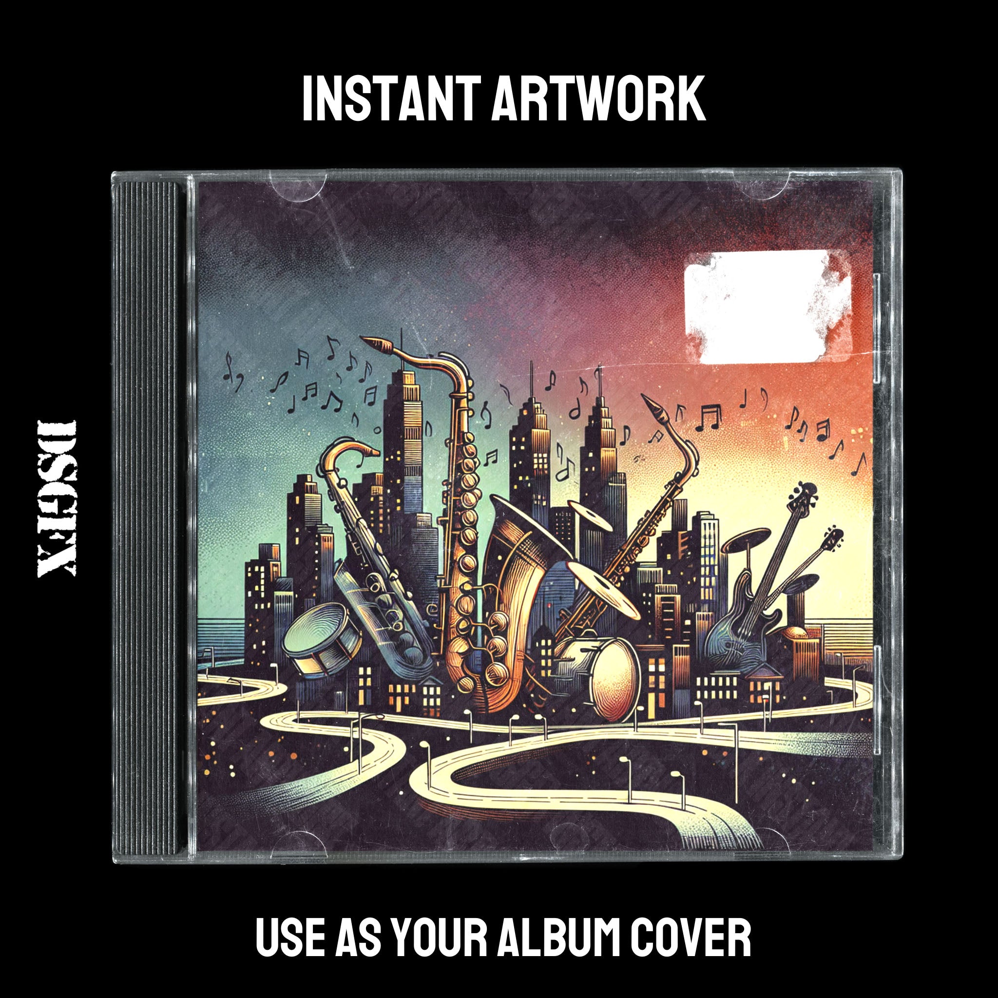 This vibrant album cover art depicts a city skyline silhouette fused with various musical instruments such as saxophones, a trumpet, a drum set, and guitars, set against a colorful dusk sky background. The dynamic composition with swirling music notes and an urban landscape makes it ideal for jazz fusion bands or artists who blend urban sounds with traditional instruments.