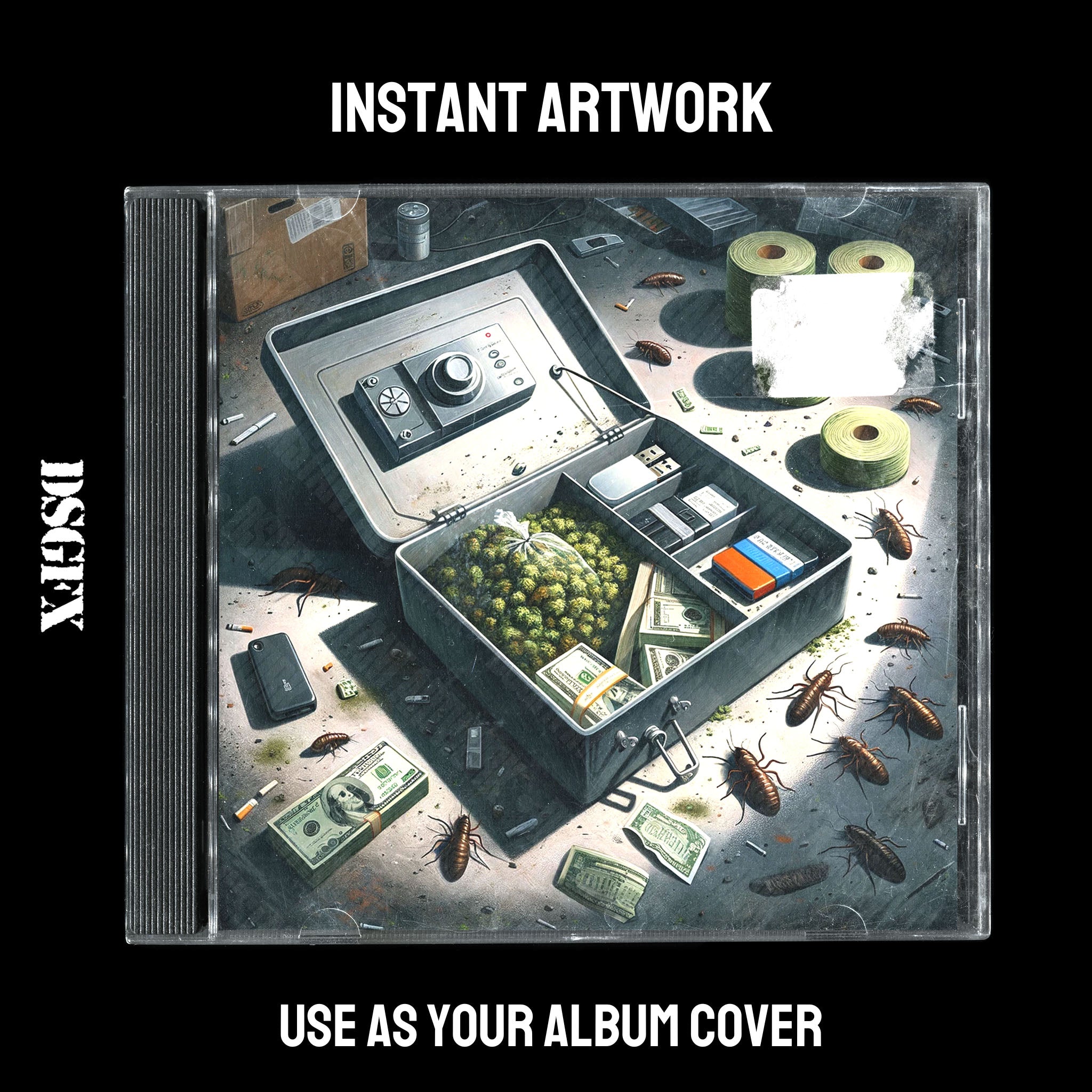 This dynamic cover art depicts an open suitcase filled with rolls of cash, loose banknotes, a vintage tape recorder, and mysterious packages suggesting urban drama and illicit activities, making it an ideal match for hip-hop artists, rappers, or storytellers looking to convey themes of hustle, intrigue, or street life in their music's visual representation.