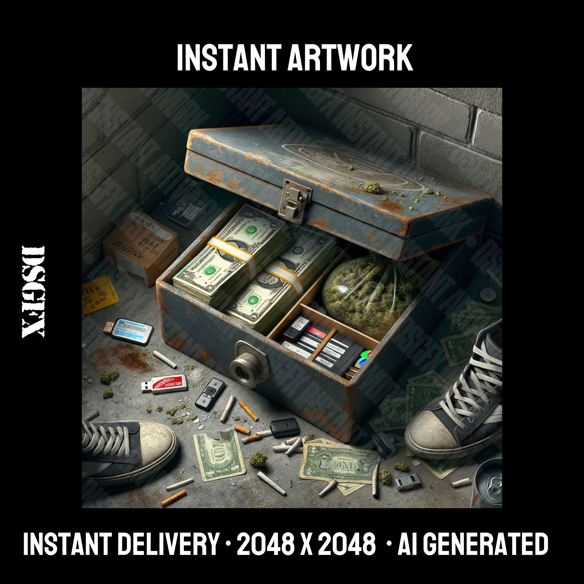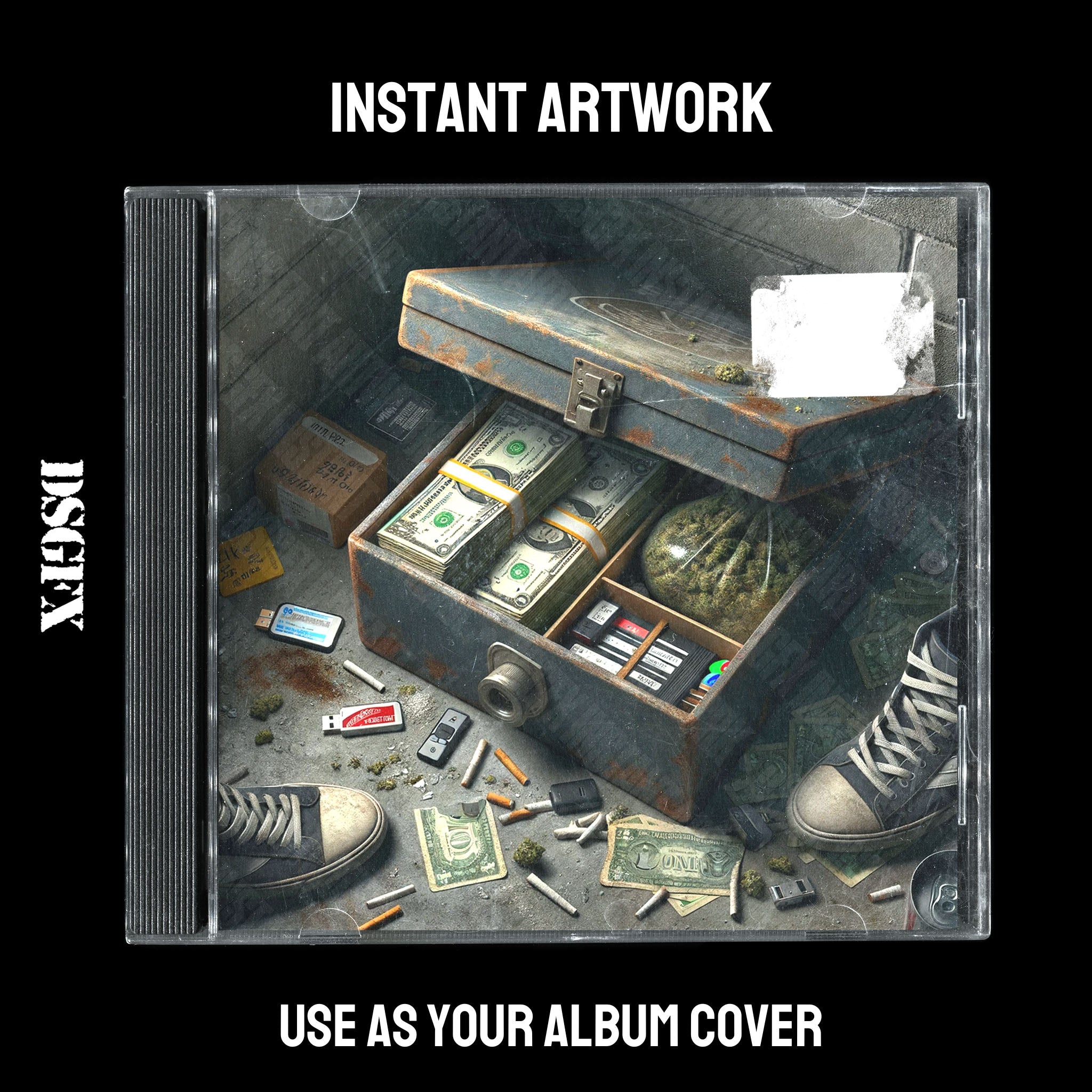This edgy cover art displays a graffitied wall background with an open, aged suitcase in the foreground filled with cash bundles, a large bag of marijuana, and various musical cassette tapes. Scattered around are rolled notes, a couple of car keys, and well-worn sneakers, suggesting a story of urban life, music, and streetwise hustle. The gritty and raw aesthetic makes it a fitting visual for hip hop, rap, and underground artists looking to convey themes of ambition, rebellion, and authenticity.