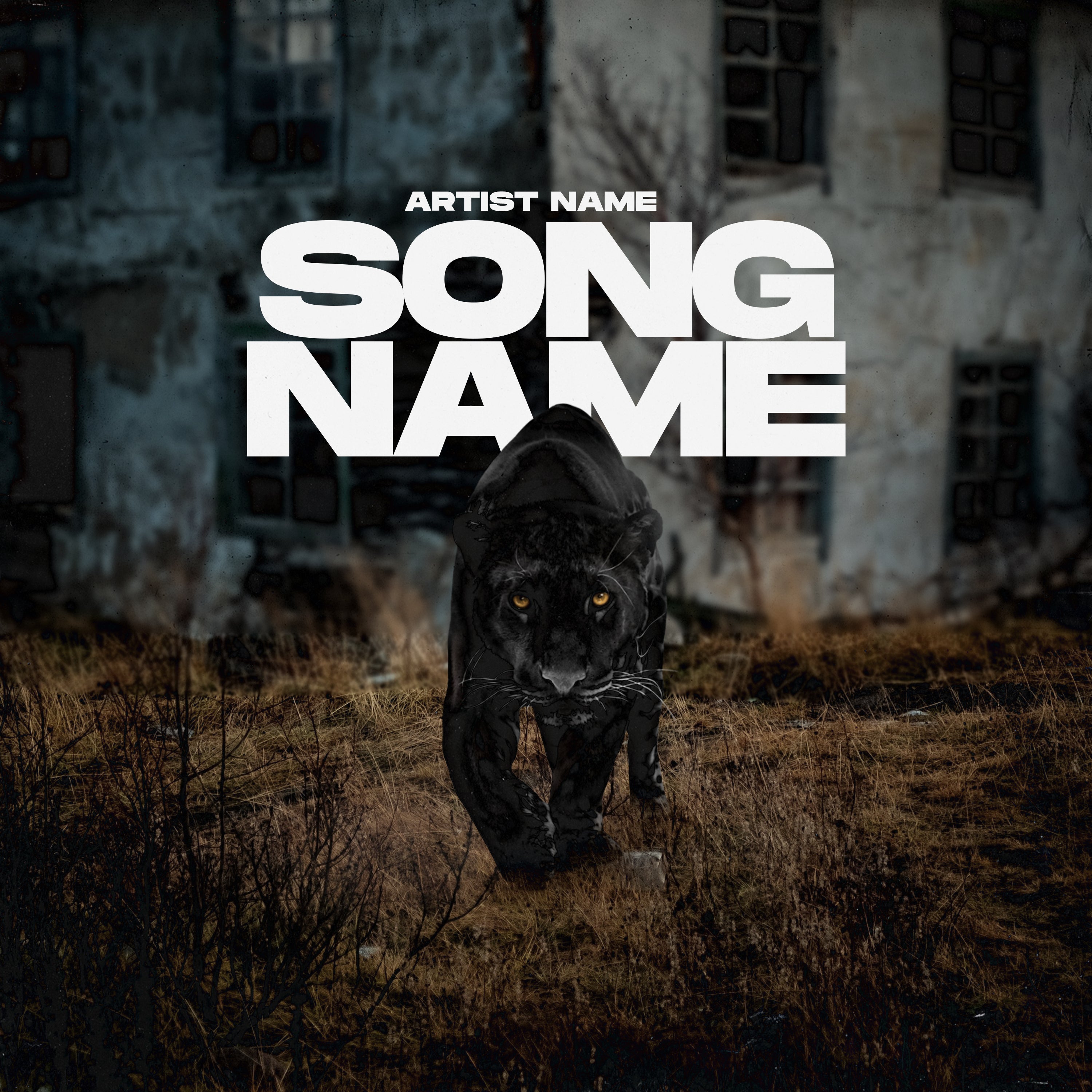 This album cover features a dark, mystical canine with glowing eyes, crouched in front of a decrepit abandoned house, evoking a sense of mystery and suspense. Ideal for hip-hop artists, dark pop musicians, or bands looking to convey a haunting or intense atmosphere in their music.