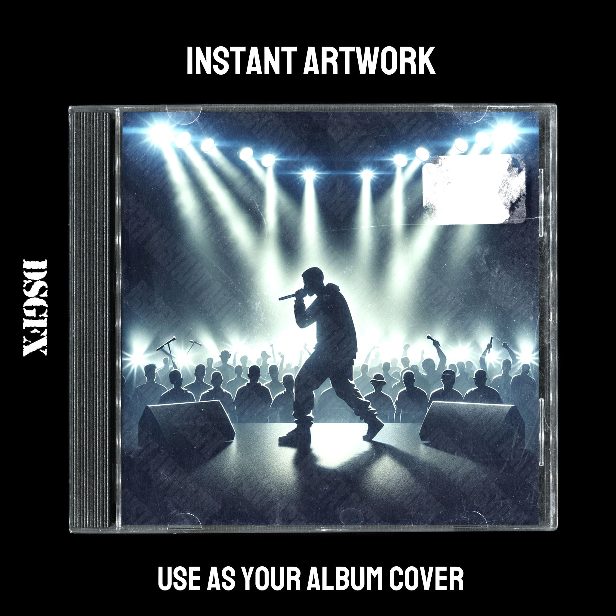 An electrifying scene captures the essence of live performance with a silhouette of a dynamic artist on stage, engaging a crowd under an array of dazzling spotlight beams. The cool tones and contrasting lights evoke a sense of excitement and movement, ideal for musicians looking to portray the thrill of a live show. This image would complement genres such as hip hop, energetic pop, rock, and electronic dance music, providing a universal appeal that resonates with the vibrant spirit of live concerts.