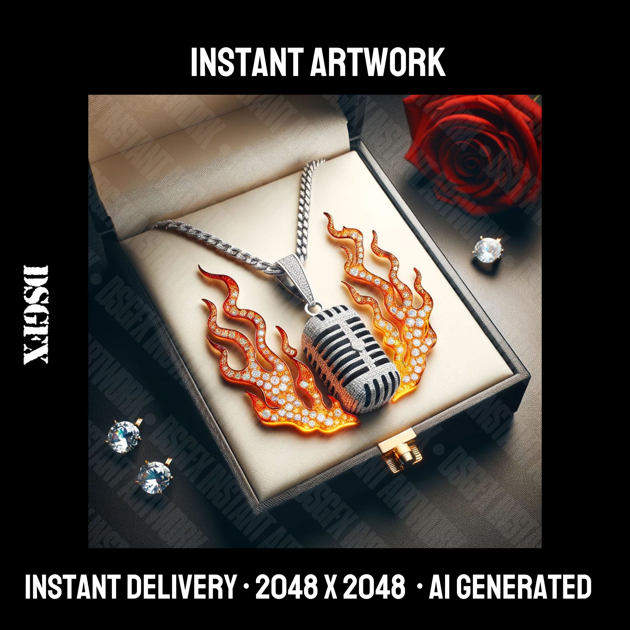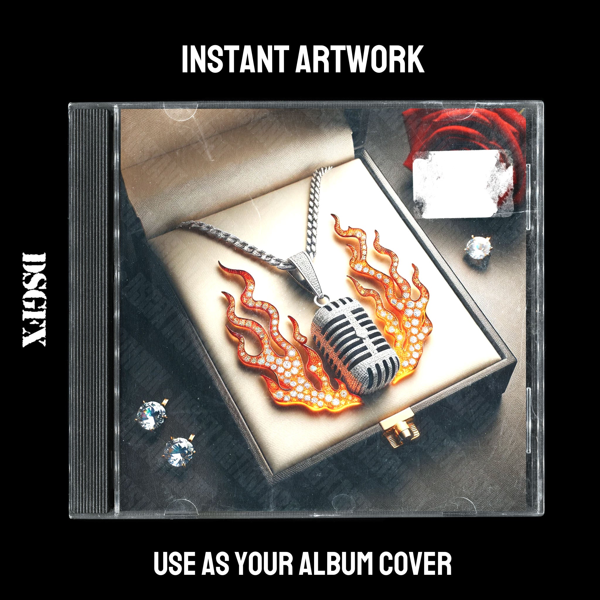 This striking cover art features a luxurious open jewelry box with a dramatic pendant shaped like a microphone engulfed in flames, nestled on a creamy beige fabric. A single lush red rose and a sparkling diamond ring further enhance the image, evoking a sense of passion and opulence. This artwork is ideal for hip hop artists, rappers, or any musician looking to convey a sense of fiery energy, wealth, and intensity in their brand.