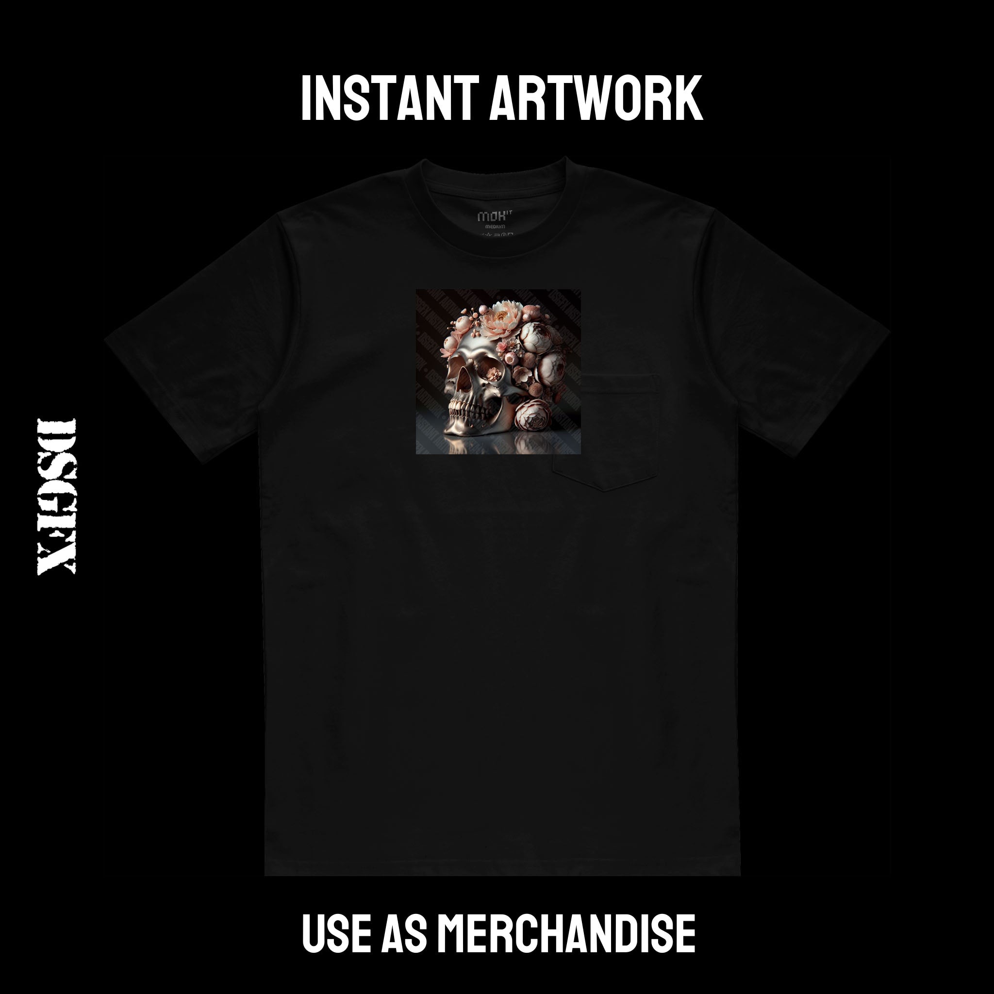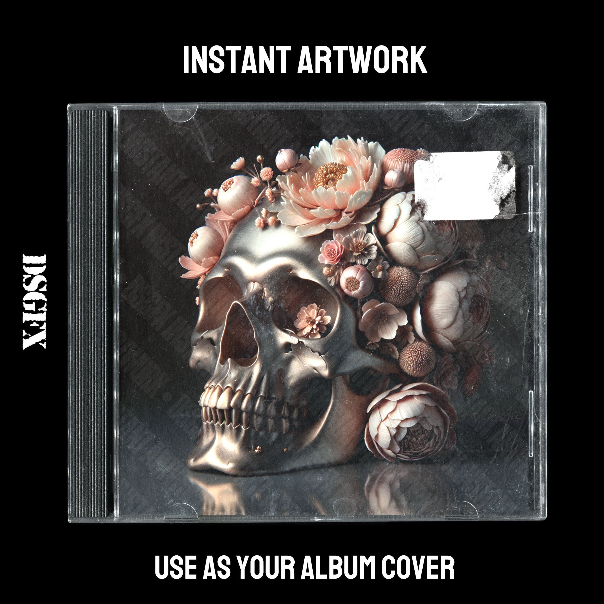 This striking visual juxtaposition marries the macabre with the beautiful, featuring a metallic human skull artfully adorned with a vibrant bouquet of flowers in full bloom, casting evocative shadows that invoke themes of life, death, and rebirth. The contrast of dark and light in this composition makes it an ideal choice for artists looking to convey depth and complexity in their music, suitable for genres such as alternative rock, brooding rap, or soulful R&B.
