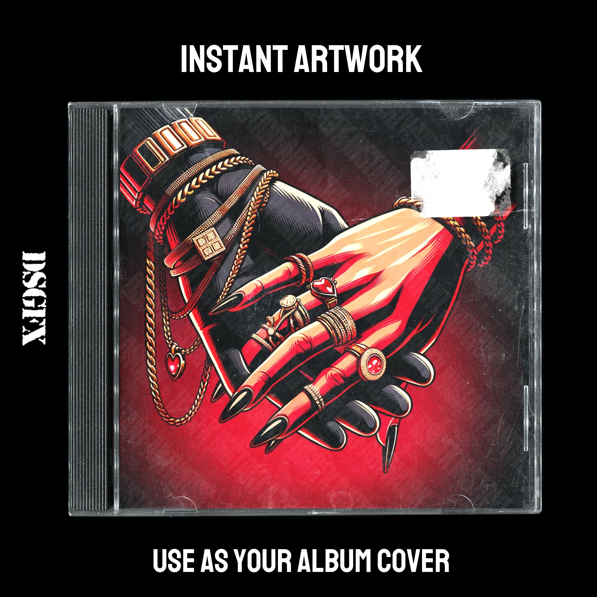 This high-resolution image showcases a detailed illustration of a hand adorned with various hip-hop inspired accessories, including a golden watch and multiple rings, against a deep red backdrop. The hand is making a subtle gesture which, combined with the accessories, exudes a sense of style and edge. This artwork is well-suited for hip hop, trap, and urban music artists looking to convey a bold, luxurious, and trendy image on their album or single covers.
